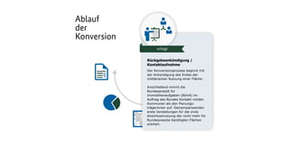 Der Konversionsprozess in Heidelberg beginnt mit der Ankündigung des Endes der militärischen Nutzung und der Kontaktaufnahme durch die BIMA mit den Kommunen zur Erörterung ziviler Nutzungsmöglichkeiten. Im Rahmen der Bestandsanalyse werden Flächen auf Altlasten und Kampfmittel untersucht, gefolgt von der Erstellung eines Nutzungskonzepts, das die Grundlage für die Vermarktung darstellt. Nach der Rückgabe der Flächen und deren Verkauf endet die Beteiligung der BIMA, während die Kommune die neue Nutzung plant.