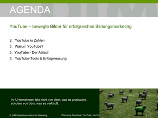 Das Dokument behandelt die Nutzung von YouTube als effektiven Kanal für Bildungsmarketing und bietet Einblicke in Statistiken, Zielgruppen sowie strategische Schritte zur Erstellung und Vermarktung von Videos. Es hebt die Bedeutung von Schlüsselwörtern und Social Media Integration hervor und nennt relevante Tools zur Erfolgsmessung. Zudem werden Empfehlungen für den optimalen Einstieg geben, um die Reichweite und Sichtbarkeit von Inhalten zu maximieren.