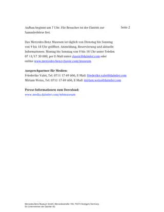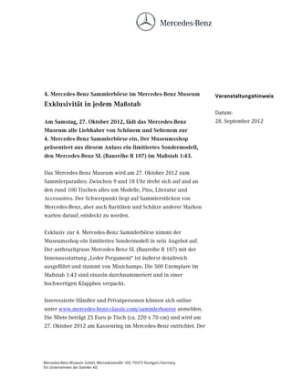 Am 27. Oktober 2012 findet im Mercedes-Benz Museum die 4. Mercedes-Benz Sammlerbörse statt, die von 9 bis 18 Uhr zahlreiche Sammlerstücke, Modelle, Pins und Literatur präsentiert. Der Museumsshop bietet ein exklusives, limitiertes Modell des Mercedes-Benz SL (Baureihe R 107) im Maßstab 1:43 an. Händler und Privatpersonen können sich für Tische anmelden, der Eintritt für Besucher ist frei.