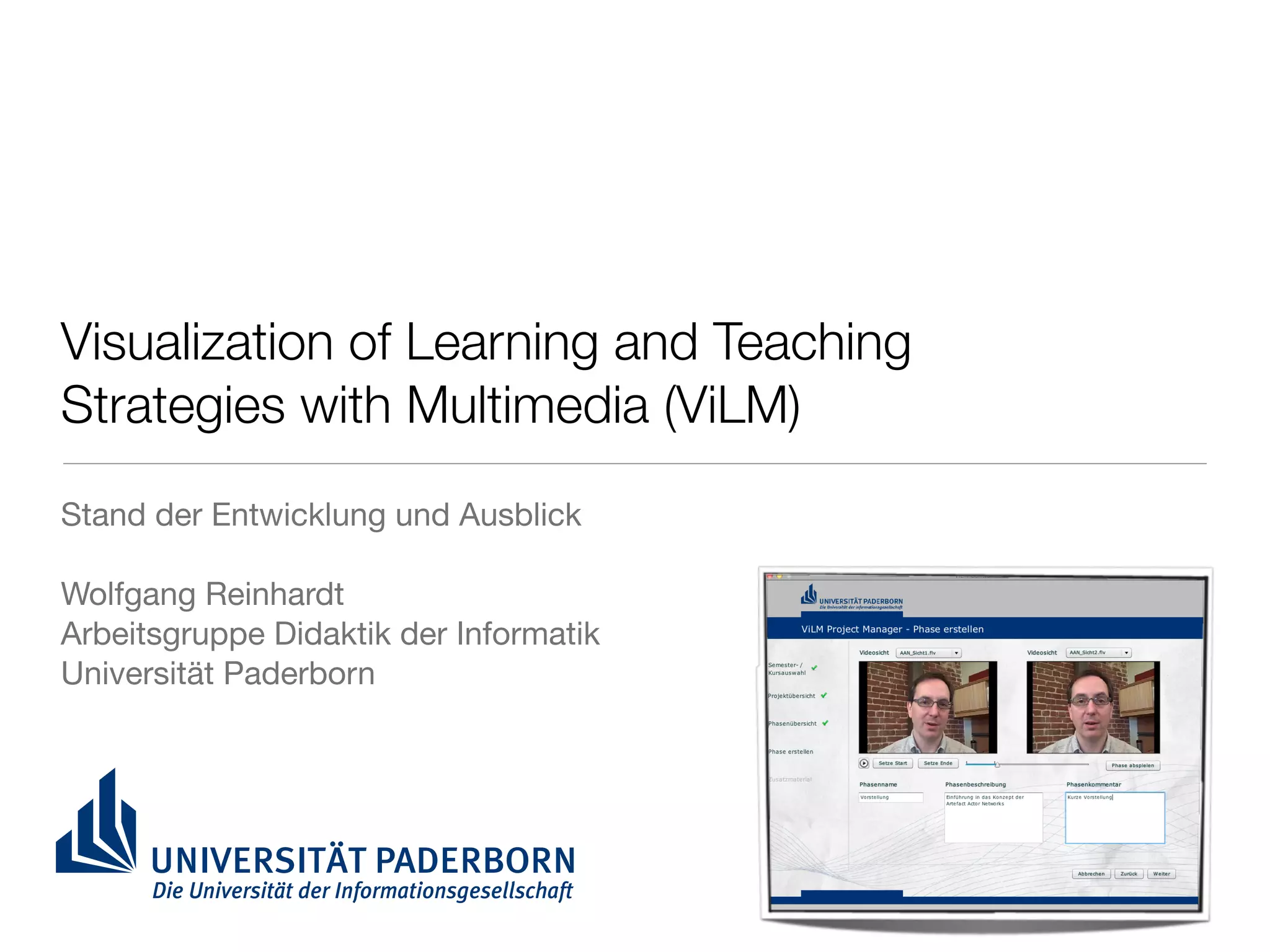 Das Dokument beschreibt die Entwicklung der Software zur Unterstützung von Videoannotationsszenarien im Kontext von Lehren und Lernen. Es werden Technologien wie Adobe Air und Wowza Streaming Server verwendet, um eine benutzerfreundliche Plattform zu schaffen, die mehrere Videoansichten und Annotationsmöglichkeiten bietet. Zukünftige Herausforderungen umfassen die Migration auf HTML5 und die Optimierung der Nutzung für größere Gruppen von Teilnehmern.