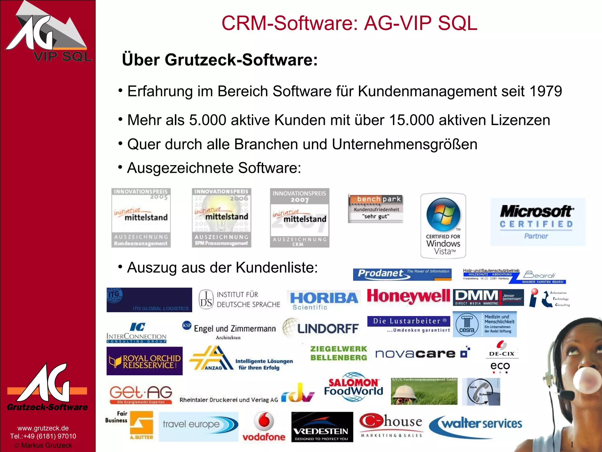 Grutzeck-Software bietet seit 1979 Lösungen im Kundenmanagement mit der Software ag-vip sql, die mehr als 5.000 Kunden und 15.000 Lizenzen bedient. Die Software ist flexibel, benutzerfreundlich und benötigt keine Programmierkenntnisse, sie unterstützt Vertriebs-, Marketing- und Servicemanagement mit individuellen Workflows und einer Integration in MS Office und Outlook. Kundenberichte loben die schnelle Einrichtung der Software und die Effizienzsteigerungen im Vertriebsprozess.