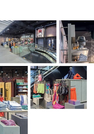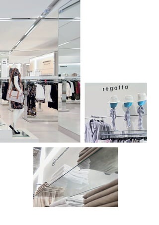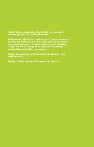 Das Dokument beschreibt visplay als eine Technologie- und Designlösung für modulare Systeme im Einzelhandel, die von Architekten und Visual Merchandisern genutzt wird, um kommerzielle Räume zu verbessern. Es hebt mehrere Projekte hervor, darunter Geschäfte von Marken wie Baldini und BMW, die visplay-Systeme zur Präsentation ihrer Produkte in stilvollem, qualitativ hochwertigem Design verwenden. Auch das Einkaufszentrum dodenhof wird erwähnt, das mit innovativen internen Designkonzepten und speziellen modularen Systemen modernisiert wurde.