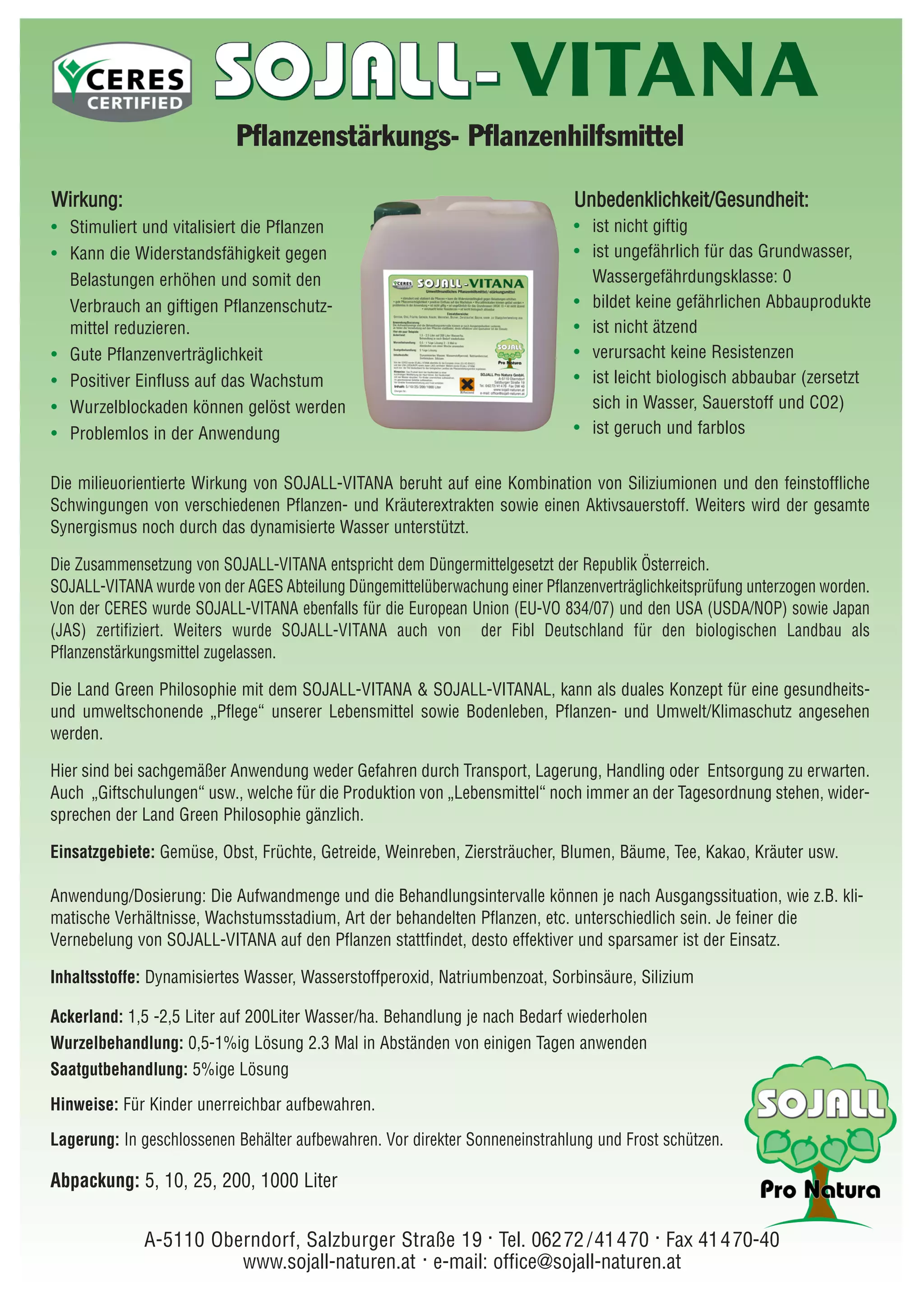 Sojall-Vitana ist ein pflanzenstärkendes Mittel, das aus einer Kombination von Siliziumionen, pflanzlichen Extrakten und dynamisiertem Wasser besteht und in der biologischen Landwirtschaft zugelassen ist. Es unterstützt das Wachstum, erhöht die Widerstandsfähigkeit der Pflanzen und reduziert den Bedarf an chemischen Pflanzenschutzmitteln. Das Produkt ist ungiftig, umweltfreundlich und einfach anzuwenden, mit spezifischen Dosierungsanweisungen je nach Pflanze und Anwendung.