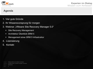 Das Dokument beschreibt ein Webinar der Inoxtech University, das die VMware Site Recovery Manager 5.0 behandelt und wichtige Themen wie Disaster Recovery, SRM-Architektur, Management und Lizenzierung umfasst. Ziel ist es, IT-Experten und Neulingen den Austausch von Wissen sowie aktuelle Trends im Bereich Virtualisierung und Cloud näherzubringen. Zudem werden die Vorteile der neuen SRM 5.0 Funktionen hervorgehoben, die eine skalierbare und effiziente Disaster Recovery Lösung bieten.