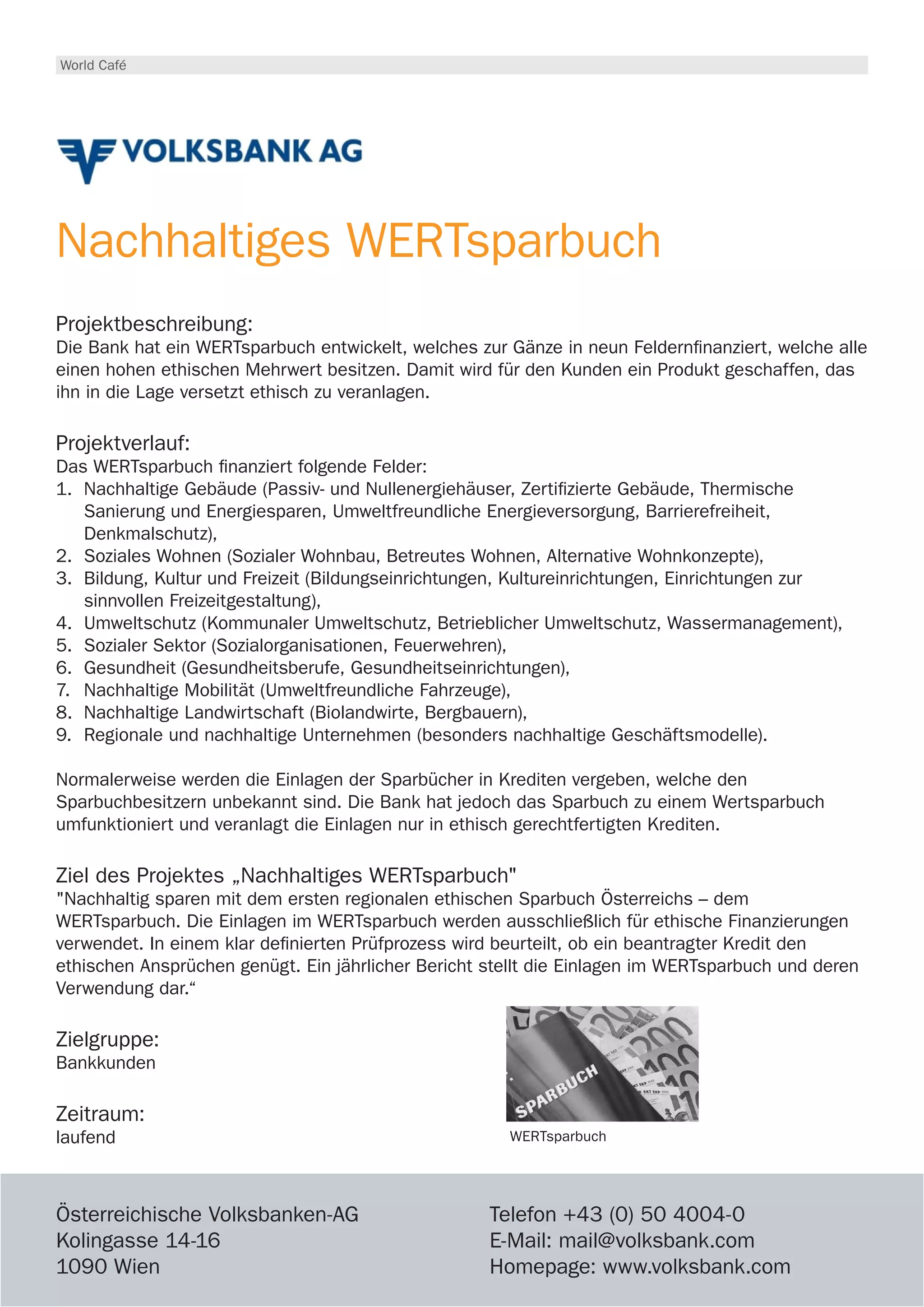Die Bank hat ein Wertsparbuch entwickelt, das in neun ethisch wertvolle Bereiche investiert, um Kunden die Möglichkeit zu geben, nachhaltig zu sparen. Die Einlagen werden ausschließlich in ethisch gerechtfertigte Kredite verwendet, die einem definierten Prüfprozess unterliegen. Der jährliche Bericht informiert über die Verwendung der Einlagen und deren ethische Aspekte.