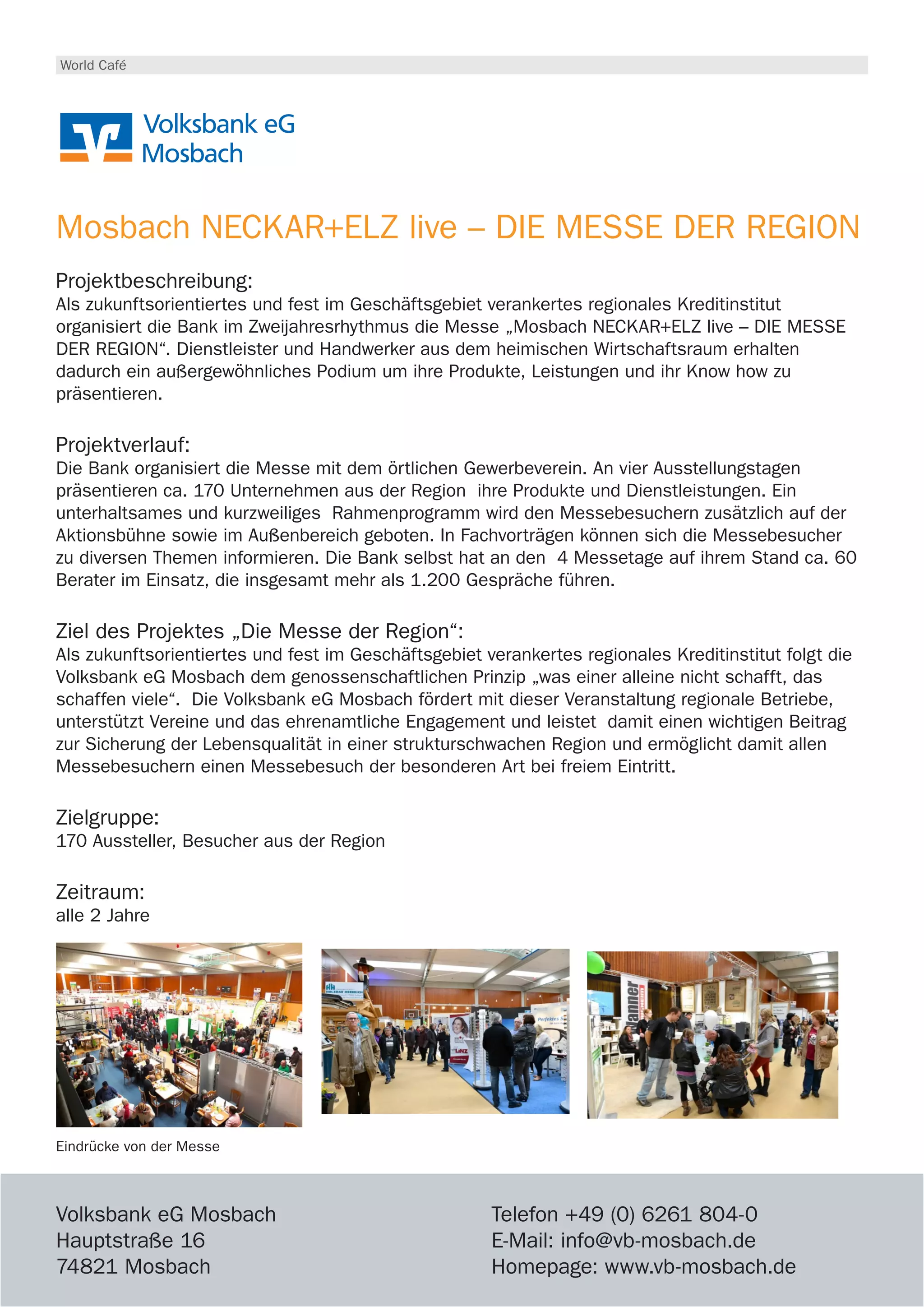 Die Volksbank EG Mosbach organisiert alle zwei Jahre die Messe 'Mosbach Neckar+Elz live', die regionalen Dienstleistern und Handwerkern eine Plattform bietet, um ihre Produkte und Dienstleistungen zu präsentieren. Rund 170 Unternehmen nehmen teil, bieten informative Vorträge und ein Rahmenprogramm, während die Bank zahlreiche Beratungen durchführt. Ziel ist es, regionale Betriebe zu unterstützen und zur Lebensqualität in der Region beizutragen, wobei der Messebesuch kostenlos ist.