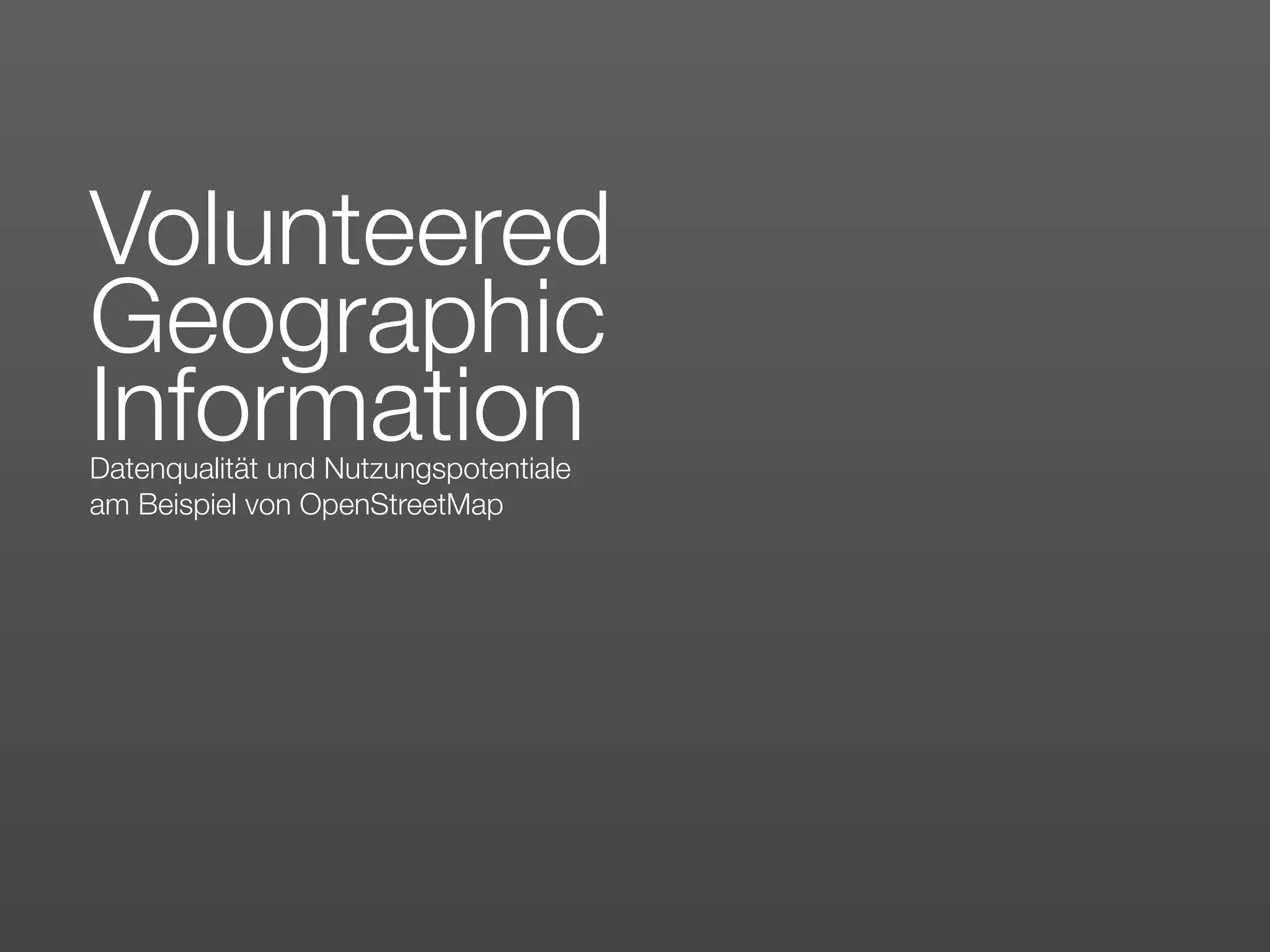 Das Dokument erörtert die Nutzung und Datenqualität von freiwilligen geographischen Informationen, insbesondere am Beispiel von OpenStreetMap, einer Plattform, die Bürger zur Erstellung geographischer Daten einlädt. Es werden Vergleiche zwischen OpenStreetMap und proprietären Geodaten sowie deren Anwendungsfälle in verschiedenen Bereichen, einschließlich Katastrophenreaktion und Routing, angesprochen. Eine Analyse der Datenqualität zeigt relative Abweichungen und Verbesserungspotentiale auf, die durch automatisierte Verfahren erzielt werden können.