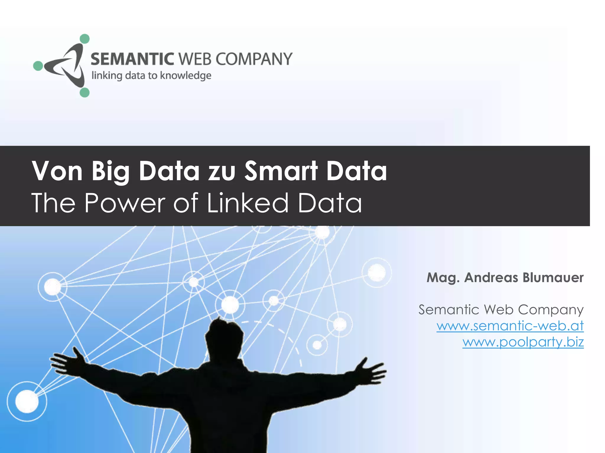 Der Vortrag von Mag. Andreas Blumauer beleuchtet die Entwicklung von Big Data zu Smart Data durch die Nutzung von Linked Data, um die Suche und Inhaltserschließung zu verbessern. Er beschreibt verschiedene Anwendungsfälle und Technologien, die semantische Verknüpfungen zwischen Informationen herstellen und die Möglichkeit komplexerer Abfragen bieten. Abschließend wird auf die Poolparty Semantic Suite hingewiesen, die Unternehmen bei der Integration und Nutzung von Wissensgraphen unterstützt.