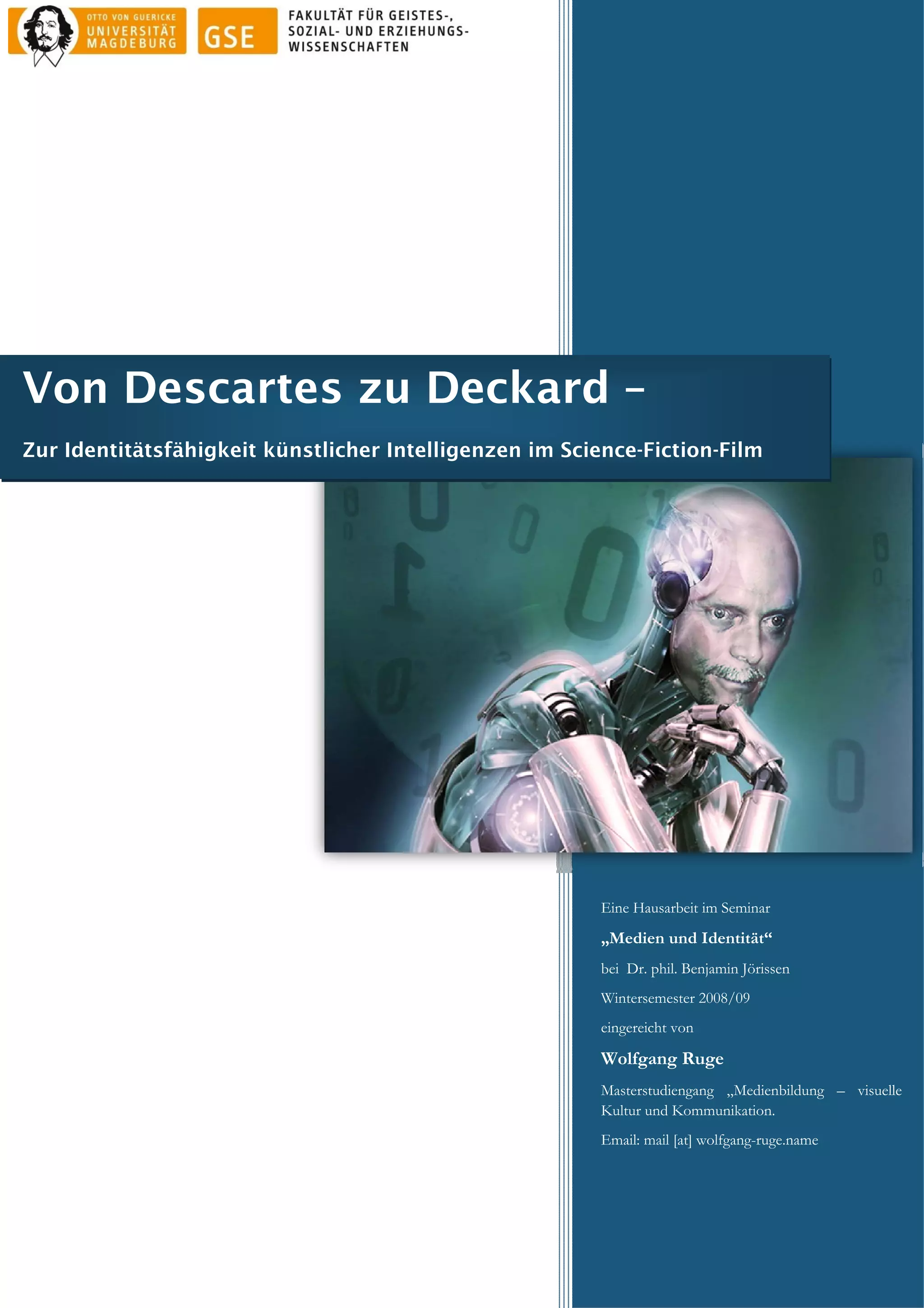Die Arbeit untersucht die Identitätsfähigkeit künstlicher Intelligenzen in Science-Fiction-Filmen, insbesondere in Bezug auf Roboter und Androiden. Sie behandelt die Wechselbeziehung zwischen Technologie, Identität und Bildungstheorie und analysiert, wie das Konzept künstlicher Identität filmsprachlich umgesetzt wird. Zudem werden verschiedene Arten künstlicher Intelligenz, deren historischer Überblick sowie die Relevanz von Science-Fiction als Forschungsfeld thematisiert.