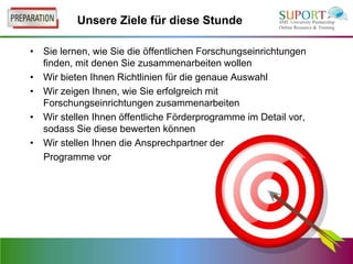 Das Dokument bietet eine umfassende Anleitung zur Zusammenarbeit mit öffentlichen Forschungseinrichtungen, einschließlich der Identifikation geeigneter Partner und der Nutzung öffentlicher Förderprogramme. Es werden Strategien zur erfolgreichen Kooperation und zur Erstellung von Forschungskooperationsverträgen vorgestellt, sowie spezifische Programme wie das 7. Forschungsrahmenprogramm und lokale Initiativen zur Unterstützung kleiner und mittlerer Unternehmen (KMU). Weitere Informationen zu Innovationsgutscheinen und Wissenstransferpartnerschaften ergänzen das Angebot, um Unternehmen bei der Entwicklung innovativer Lösungen zu unterstützen.