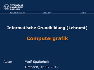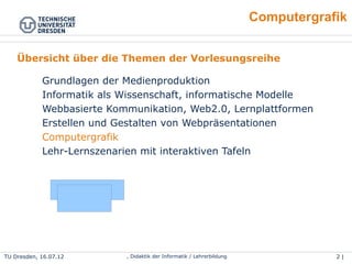 Das Dokument behandelt die Grundlagen der Computergrafik, einschließlich der Themen Pixelgrafik und Vektorgrafik, Bildformate und Farbräume. Es bietet eine detaillierte Übersicht über die Auflösung, Farbtiefe und Dateien wie BMP, JPEG und PNG sowie deren Einsatzmöglichkeiten und Komprimierungsmethoden. Zudem werden Methoden zur Bildbearbeitung und die Verwendung von Ebenen zur effektiveren Gestaltung von Grafiken erklärt.