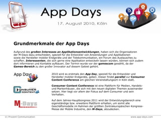 Die App Days sind eine Veranstaltung, die speziell für Entwickler von Anwendungen und Hersteller mobiler Endgeräte konzipiert wurde und findet am 17. August 2010 in Köln statt. Ziel ist der Austausch von Wissen und Kontakten zwischen Entwicklern und Interessierten, während das Event parallel zur Consumer Content Conference und einen Tag vor der Gamescom durchgeführt wird. Die Veranstaltung wird über Sponsoren finanziert, und Teilnehmer können an 'Speed-Meetings' und Vorträgen teilnehmen, um neue Entwicklungen in der Technologie zu erörtern.