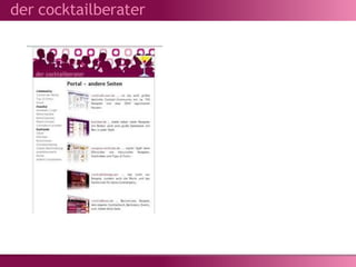 Das Projekt "der Cocktailberater" präsentiert eine interaktive Plattform für Cocktailliebhaber mit einer umfangreichen Rezeptdatenbank, die verschiedene Suchmöglichkeiten bietet und die Benutzer mit Funktionen wie Kommentaren und Bewertungen einbezieht. Es zielt darauf ab, eine internationale Community zu schaffen, die sich für Cocktails begeistert und gleichzeitig die Qualität und Benutzerfreundlichkeit in den Vordergrund stellt. Das Portal soll durch monatliche Newsletter, Desktopanwendungen und ein benutzergeschütztes Bereich erweitert werden.