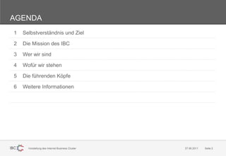 Das Internet Business Cluster (IBC) ist eine Kooperation zwischen Wissenschaft und Praxis, die führende Unternehmen der deutschen Internetwirtschaft vernetzt, um den digitalen Standort Deutschland durch praxisnahe Forschung und Talentförderung zu stärken. Das Dokument beschreibt die Mission, Ziele und die Struktur des IBC sowie die wichtigsten Akteure und deren Beiträge zur Internetwirtschaft. Es werden verschiedene Initiativen zur Talentschaffung, Forschung und Wirtschaftsentwicklung aufgeführt, insbesondere im Hinblick auf den digitalen Sektor.