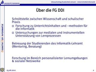 Der Infonachmittag zum Lehramtsstudium Informatik an der Universität Paderborn informiert über die Struktur des Studiengangs, einschließlich Bachelor- und Masteroptionen sowie die Praxismodule. Es werden Didaktik- und Fachthemen behandelt, die die Verbindung zwischen Theorie und Praxis im Informatikunterricht stärken. Zudem werden Forschungsschwerpunkte und Unterstützungsangebote für Studierende vorgestellt.