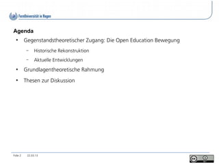 Das Dokument beleuchtet die Entwicklung der Open Education Bewegung, von ihren ideologischen Anfängen in den 1960/70er Jahren über die Wiederbelebung durch Open Educational Resources (OER) und MOOCs bis hin zu gegenwärtigen Herausforderungen wie Kommerzialisierung und Exklusion. Es diskutiert die Potenziale von OER für Chancengleichheit und kulturellen Austausch sowie die moralischen Fragestellungen, die sich aus der Bildungsgestaltung ergeben. Abschließend werden Thesen zur kontinuierlichen Reformbewegung und zur Notwendigkeit eines neuen Denkens in der Bildung präsentiert.