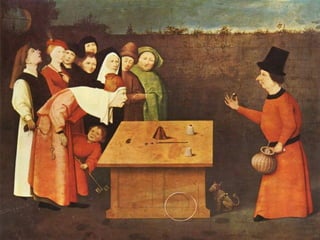 Das Dokument behandelt die Kunst der Zauberei, deren Ursprünge in der Antike und wichtige Zauberer wie Johann Nepomuk Hofzinser und Jean-Eugène Robert-Houdin. Es beschreibt verschiedene Täuschungsarten, einschließlich psychologischer Techniken und visueller Illusionen, die auf menschlicher Wahrnehmung basieren. Die Fähigkeit zu zaubern wird als Ergebnis jahrelanger wissenschaftlicher Studien und menschlicher Erfahrung betrachtet.