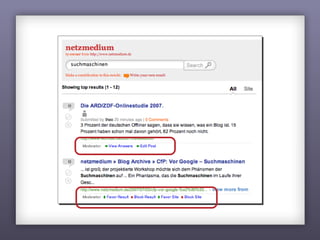 Das Dokument von Theo Röhle untersucht das Konzept der sozialen Suche im Kontext von Werbung und Information, wobei die Entwicklung des Suchmaschinenmarketings von den Anfängen bis heute thematisiert wird. Es wird betont, wie personalisierte Vertikalsuchen und Verhaltens-Targeting die Intention der Nutzer besser verstehen können. Zudem wird auf die Konflikte eingegangen, die durch Web 2.0 und Nutzerüberwachung entstehen.