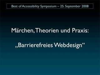 Das Dokument behandelt das Thema barrierefreies Webdesign und dessen Bedeutung für Menschen mit Behinderungen, insbesondere im Hinblick auf die Zugänglichkeit von Webseiten. Es werden wesentliche Anforderungen und Richtlinien vorgestellt, die sicherstellen, dass Inhalte für alle Nutzer, einschließlich älterer Menschen und Personen mit Einschränkungen, wahrnehmbar, bedienbar und verständlich sind. Der Text ermutigt dazu, an der Umsetzung barrierefreier Lösungen festzuhalten und Herausforderungen im Web weiterhin zu adressieren.