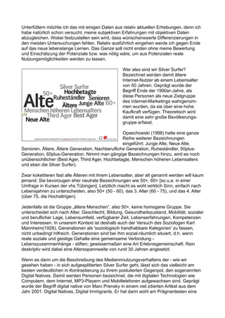 Der Vortrag behandelt den Begriff 'Silver Surfer' für Internetnutzer über 50 Jahre und deren Partizipationspotenziale im digitalen Raum. Er erläutert, dass diese Gruppe heterogen ist und sich durch verschiedene demografische Merkmale unterscheidet, wobei sie oft als passive Konsumenten wahrgenommen wird. Der Referent argumentiert, dass ältere Menschen, die den technologischen Wandel aktiv miterlebt haben, über wertvolle digitale Kompetenzen verfügen, die es zu fördern gilt.