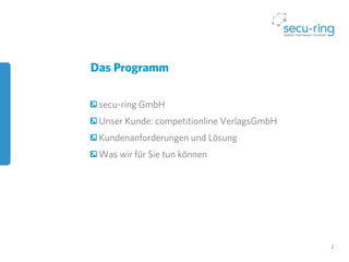 Die Secu-Ring GmbH bietet Lösungen zur Gewährleistung von Hochverfügbarkeit, Lastverteilung und Serverautomatisierung für die Competitionline Verlagsgesellschaft mbH, Marktführer im Bereich Architekturausschreibungen. Unter Berücksichtigung der hohen Anforderungen an Service, Verfügbarkeit, Sicherheit und Zuverlässigkeit werden optimierte Betriebskonzepte und eine vollumfängliche IT-Unterstützung bereitgestellt. Kunden profitieren von einer hohen Qualität durch erprobte Systeme, vollständigem Service und individuellen Lösungen.