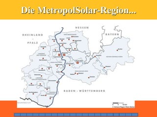 Das Dokument beschreibt eine Veranstaltung der Metropolsolar-Region, die auf die Stärkung lokaler Akteure für erneuerbare Energien abzielt und die Mitgliederzahl auf 600 bis Ende 2014 erhöhen möchte. Es werden Informationen zur aktuellen Photovoltaik-Förderung und den Möglichkeiten zur eigenständigen Energienutzung, wie Balkon- und Steckdosenmodule, bereitgestellt. Zudem wird kritisiert, dass die Politik bei der Energiewende versagt und die Bürger aktiv werden müssen.