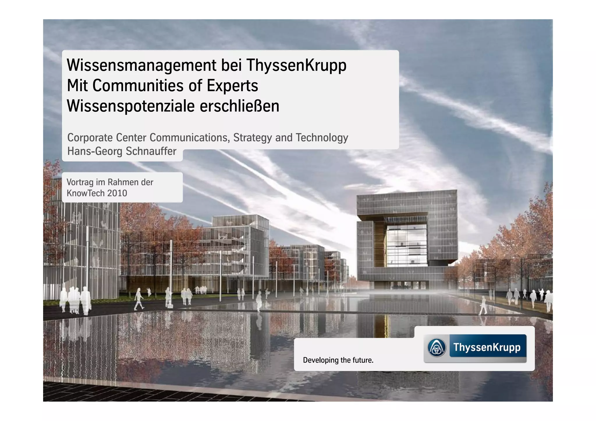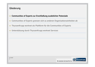 Das Dokument beschreibt die Rolle von Communities of Experts bei thyssenkrupp, die zur Förderung des Wissensmanagements und zur Erschließung zusätzlicher Potenziale dienen. Diese Netzwerke ermöglichen den Austausch von Wissen und Erfahrungen über Abteilungs- und Hierarchiegrenzen hinweg und fördern eine Kultur der Zusammenarbeit und Innovation. Die Communities unterstützen die organisatorische Struktur, indem sie Transparenz schaffen, die Meinungsbildung unterstützen und die Entscheidungstransparenz verbessern.
