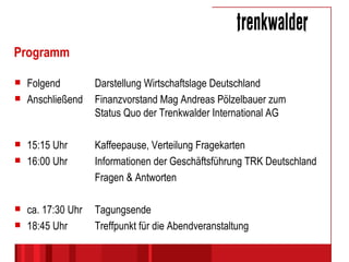 Das Dokument beschreibt das Trenkwalder-Event "Gemeinsam erfolgreich arbeiten" am 27. Februar 2009, das Informationen zur wirtschaftlichen Lage Deutschlands und den Status der Trenkwalder International AG bietet. Es thematisiert die Auswirkungen der Finanzkrise seit 2007, darunter Unternehmensinsolvenzen, Stellenabbau und staatliche Rettungsmaßnahmen. Zudem nennt es wichtige Termine und Abläufe während der Veranstaltung, einschließlich einer Abendveranstaltung.