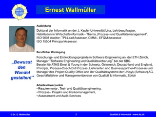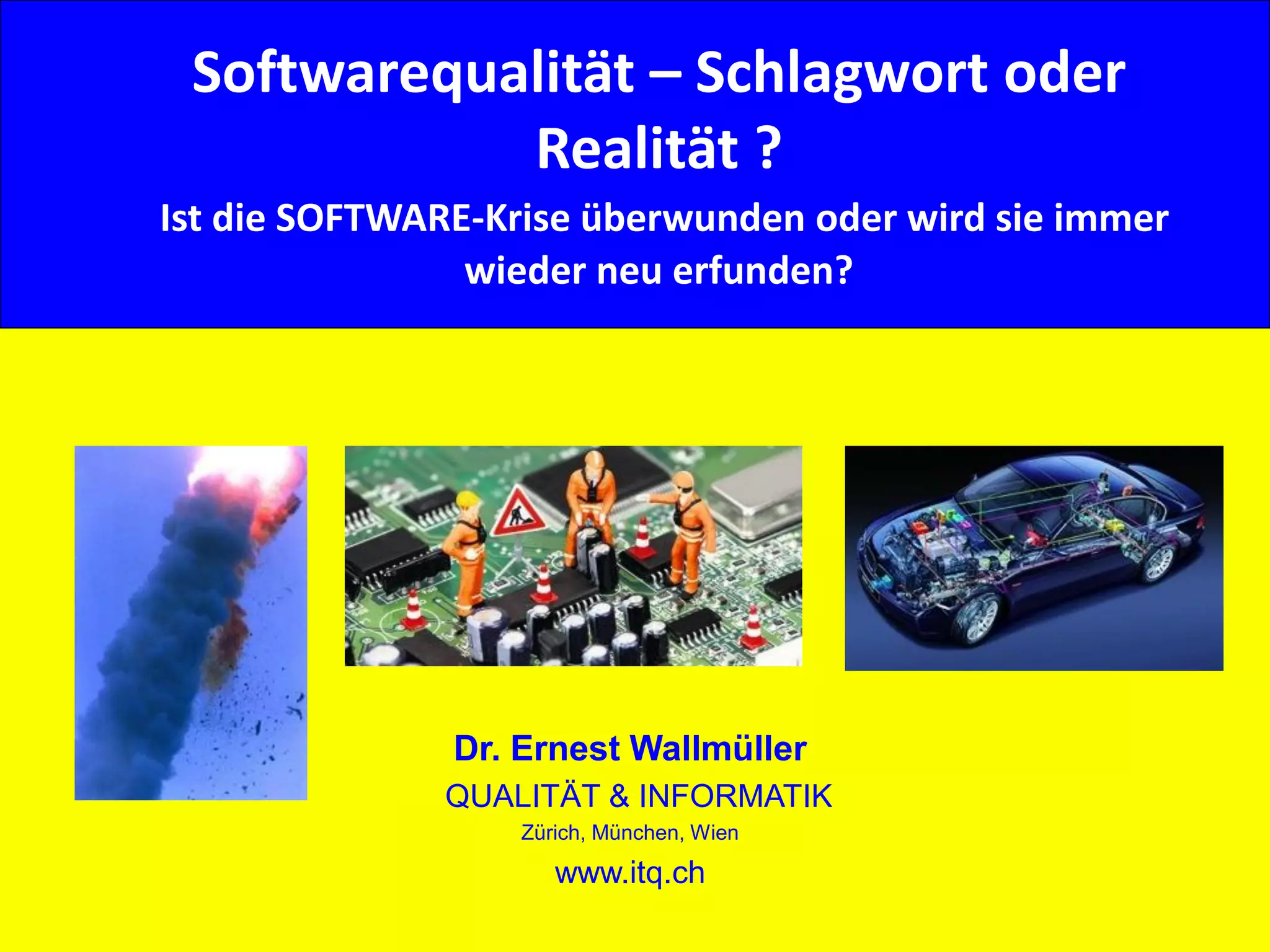 Das Dokument von Dr. Ernest Wallmüller behandelt die Herausforderungen und Trends in der Softwarequalität und deren Management, und weist darauf hin, dass die Softwarekrise von damals weiterhin relevant ist. Es wird betont, dass technologische Fortschritte, Globalisierung und Individualisierung Einfluss auf die Softwareentwicklung haben und dass der Faktor Mensch sowie das Verständnis für Prozesse entscheidend sind. Zusammenfassend wird die Notwendigkeit unterstrichen, Standards und Best Practices zu combinen, um die Qualität in Softwareprojekten nachhaltig zu sichern.