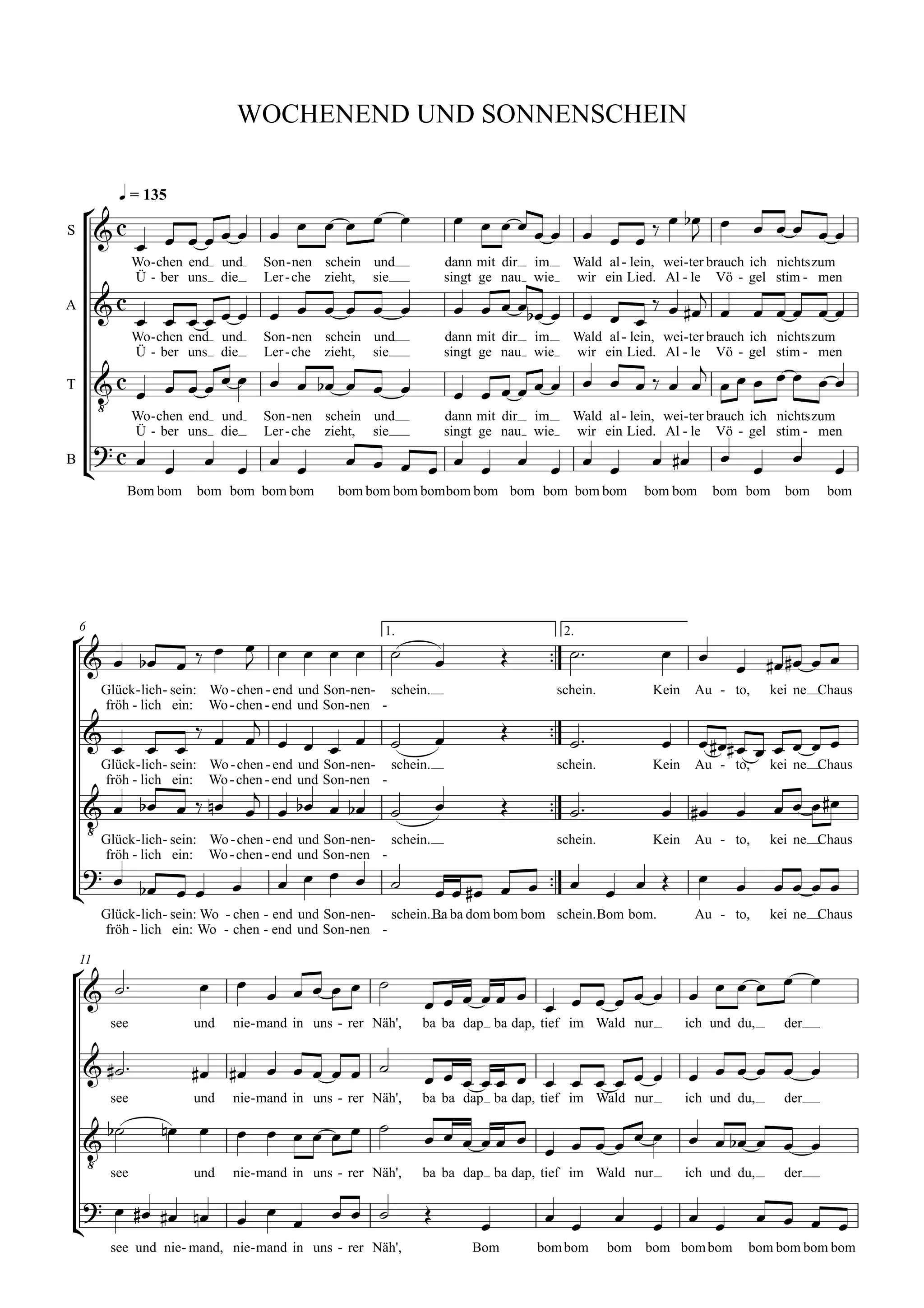 Das Dokument enthält den Text eines Liedes, das sich um die Themen Glück, Natur und die Freude an gemeinsamen Momenten dreht. Es beschreibt die Harmonie der Natur und das Zusammensein mit einem geliebten Menschen am Wochenende. Durch wiederkehrende Verse und Melodien vermittelt es eine fröhliche und unbeschwerte Atmosphäre.