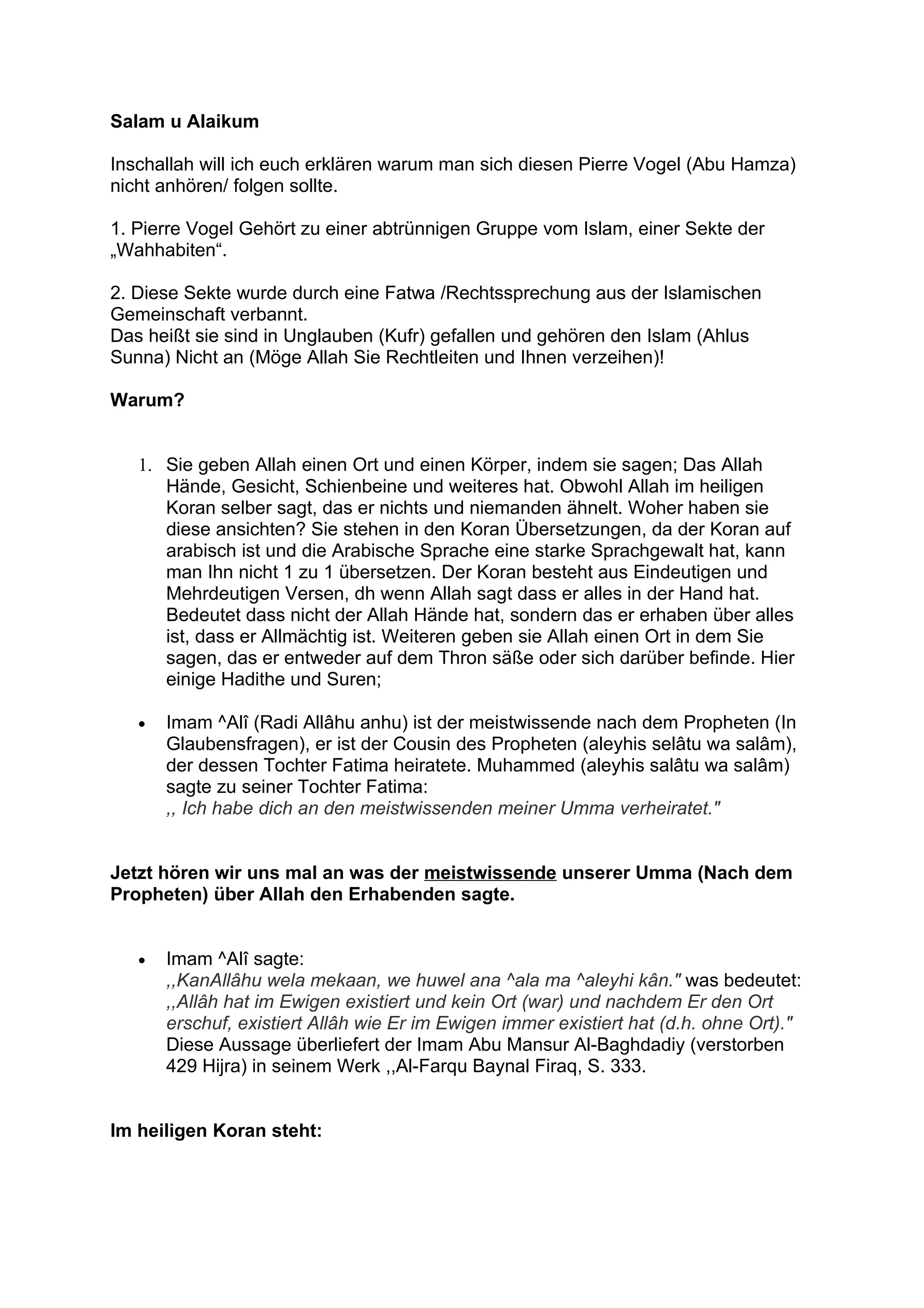 Der Text warnt vor Pierre Vogel (Abu Hamza) und seiner Zugehörigkeit zur wahhabitischen Sekte, die vom Islam abweicht und als unglaubwürdig gilt. Es wird betont, dass diese Gruppe falsche Ansichten über Allah hat, gegen den lehrmäßigen Konsens der sunnitischen Gemeinschaft verstößt und in historische Untaten verwickelt ist. Zudem wird darauf hingewiesen, dass deren Verbreitung durch saudische Unterstützung und falsche Selbstdarstellungen geschieht, weshalb Muslime gewarnt werden, sich nicht von ihnen irreleiten zu lassen.
