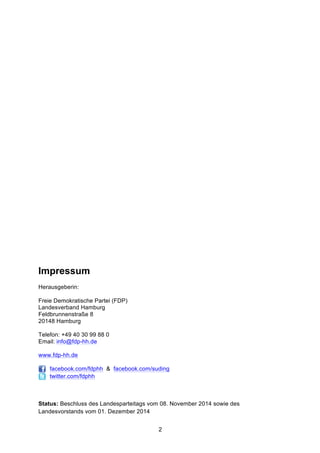 Das Wahlprogramm der FDP Hamburg 2015 setzt sich für eine liberale und zukunftsorientierte Politik ein, die Bildung, Wirtschaft und Infrastruktur fokussiert. Es betont die Notwendigkeit von Transparenz und Freiheit im Bildungssystem sowie Rahmenbedingungen, die unternehmerisches Handeln fördern. Die FDP ruft die Bürger zur aktiven Teilnahme an der Wahl auf, um ein besseres Hamburg zu gestalten, das Chancen und Rechte für alle bietet.