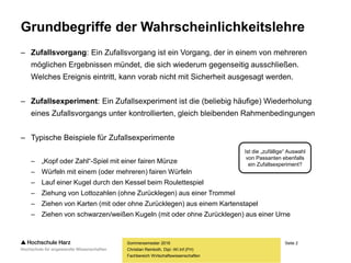 Das Dokument behandelt grundlegende Konzepte der Wahrscheinlichkeitstheorie, Mengenlehre und Kombinatorik und deren Anwendung in Zufallsexperimenten, wie z.B. Würfeln oder Münzwurf. Es erläutert zentrale Begriffe wie Ereignisse, Mengen und logische Operatoren sowie die Rechenregeln für Mengen. Zudem wird der klassische Wahrscheinlichkeitsbegriff nach Laplace und die dazugehörigen Axiome von Kolmogorov vorgestellt.