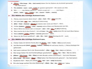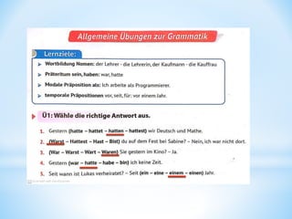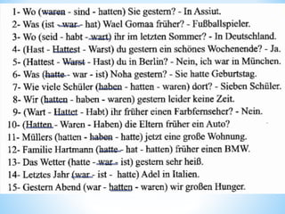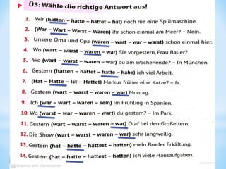 Das Dokument behandelt deutsche Grammatik, insbesondere die Verwendung der Verben 'sein' und 'haben' in der Vergangenheit. Es bietet Beispiele für die Konstruktion von Sätzen und ermutigt zur Bildung eigener Sätze. Zudem enthält es Informationen zu den Lizenzbedingungen, unter denen der Text veröffentlicht ist.