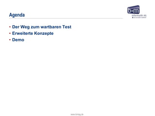 Das Dokument behandelt die Implementierung wartbarer Oberflächentests für Webanwendungen mit Open-Source-Software, insbesondere unter Verwendung des Selenium Web Drivers für Browser-Automation. Es beschreibt Konzepte wie Testfall-Architektur, Integration mit JUnit und den Einsatz von Page-Objekten zur Verbesserung der Wartbarkeit und Lesbarkeit. Zudem werden erweiterte Konzepte wie parallele Testausführung und Testdatenanbindung angesprochen, um die Effizienz von Tests zu steigern.