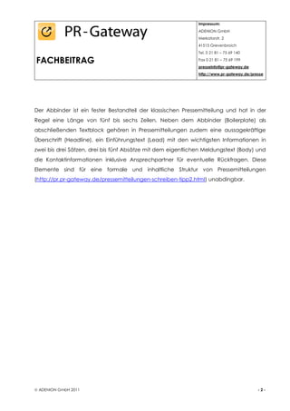 Der Text erklärt den Abbinder (Boilerplate) als ein wichtiges Element von Pressemitteilungen, das eine Unternehmensbeschreibung bietet und abschließend Informationen über das Unternehmen bereitstellt. Er enthält grundlegende Daten wie Name, Sitz, Gründung, Tätigkeitsfelder und Leistungsangebot, um Lesern, einschließlich Journalisten, einen schnellen Überblick zu ermöglichen. Der Abbinder ist in der Regel ein konstanter Textblock, der nur aktualisiert wird, wenn sich wesentliche Unternehmensinformationen ändern.