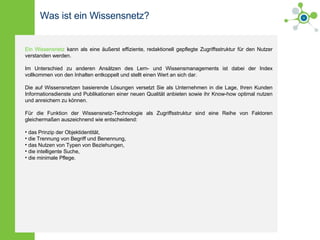 Ein Wissensnetz ist eine effiziente Struktur für den Zugriff auf Informationen, die Inhalte von Indizes trennt und Unternehmen ermöglicht, ihre Kenntnisse zu optimieren. Es basiert auf Prinzipien wie Objektidentität und der Trennung von Begriffen und Benennungen und nutzt verschiedene Beziehungstypen zur Informationenverknüpfung. Beispielsweise können Unternehmen durch ein Wissensnetz relevante Informationen schnell abrufen und effizient organisieren, wodurch sie bessere Dienstleistungen und Publikationen für ihre Kunden anbieten können.