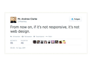 Das Dokument beschreibt die Prinzipien des Responsive Webdesigns, das die Anpassung von Webseiten an verschiedene Bildschirmgrößen und Geräte ermöglicht. Es wird auf die Notwendigkeit von flexiblen Layouts, relativen Maßen, flexiblen Medien und Media Queries eingegangen, um eine eine konsistente Benutzererfahrung zu gewährleisten. Zudem werden Verbesserungen und Best Practices für eine effektive mobile Strategie hervorgehoben.
