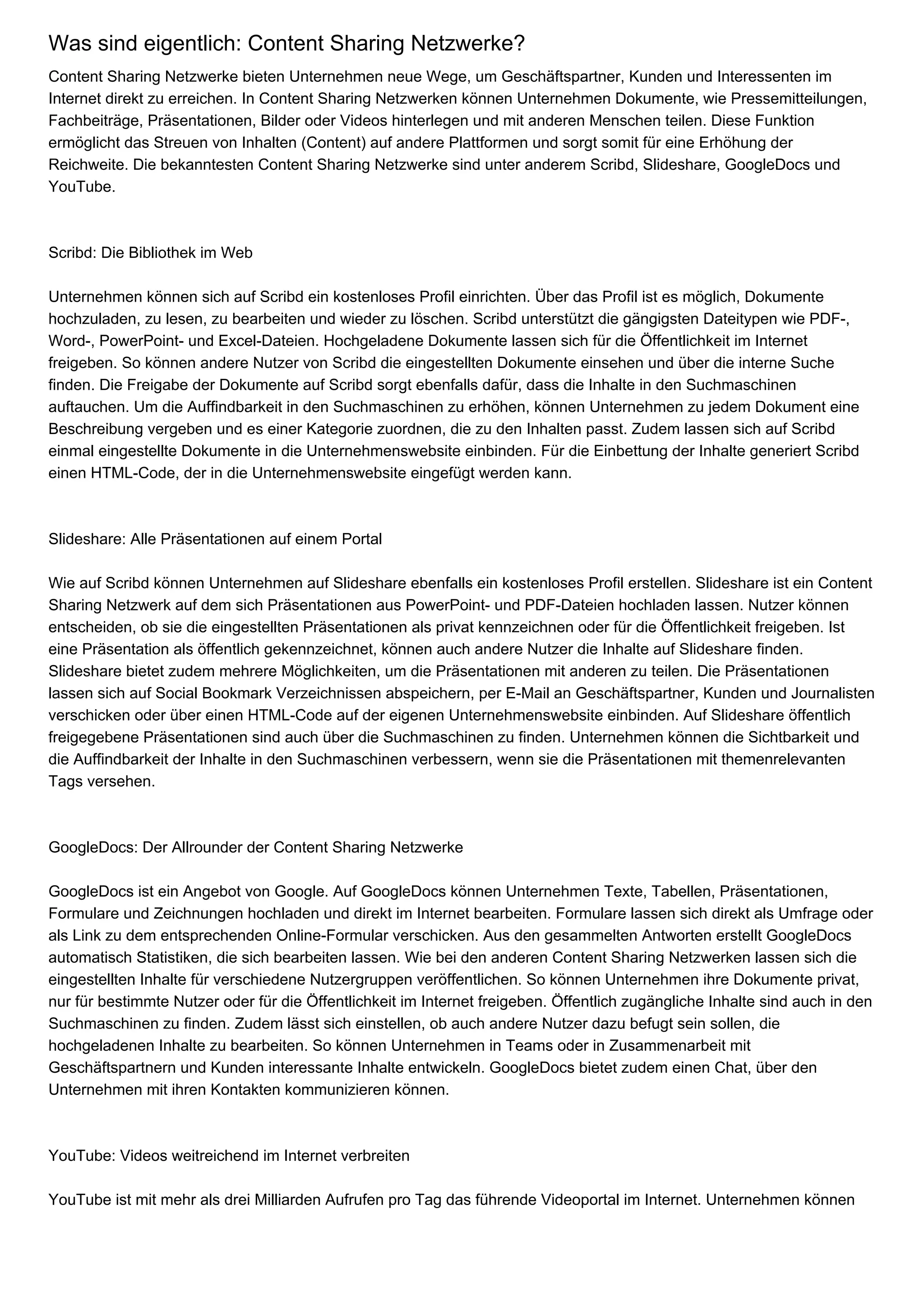 Content Sharing Netzwerke ermöglichen es Unternehmen, direkt mit Partnern, Kunden und Interessenten über das Internet zu kommunizieren, indem sie Dokumente und Medien wie Pressemitteilungen und Videos teilen. Bekannte Plattformen wie Scribd, Slideshare, Googledocs und YouTube bieten unterschiedliche Funktionen zur Dokumentenfreigabe, Suchmaschinenoptimierung und erweiterten Benutzerinteraktionen. Die regelmäßige Veröffentlichung auf diesen Netzwerken erhöht die Sichtbarkeit und Reichweite von Unternehmensinhalten im Internet.