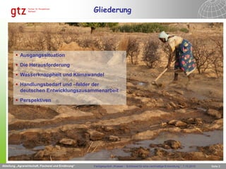 Das Dokument thematisiert die zentrale Rolle von Wasser für die Ernährungssicherung und die Herausforderungen durch Wasserknappheit und Klimawandel. Es skizziert Handlungsempfehlungen für die deutsche Entwicklungszusammenarbeit, einschließlich besserer Wasserressourcenmanagement, effizienterer Bewässerungstechniken und intersektoraler Koordination. Langfristig sollte die Aufmerksamkeit auf die Wassernutzung in der Landwirtschaft verstärkt werden, um die Ernährung von wachsenden Bevölkerungen zu sichern.