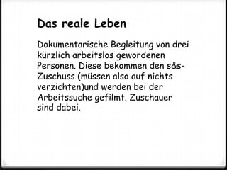 Das Dokument beschreibt die dokumentarische Begleitung von drei arbeitslos gewordenen Personen, die den 'watch & support'-Zuschuss erhalten und bei der Jobsuche gefilmt werden. Es wird betont, dass die Zielgruppe die realistischen Auswirkungen des Produkts sieht und auf nichts verzichten muss. Die Inhalte werden über verschiedene digitale Plattformen wie eine eigene Homepage, YouTube, Facebook und Twitter verbreitet.