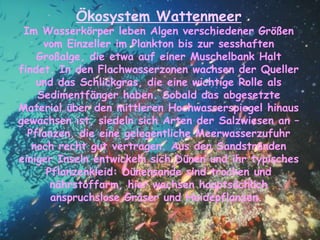 Das Wattenmeer ist ein einzigartiges, gezeitenabhängiges Ökosystem an der Nordseeküste, das von einer Vielfalt an Pflanzen und Tieren geprägt ist, darunter Algen, Schlickgras und Robben. Es entstand nach dem Abschmelzen der Gletscher und war historischem Wandel durch Sturmfluten und Sedimentdynamik unterworfen, die die Küstenlinie beeinflussten. Menschliche Eingriffe durch Deichbau und Landwirtschaft verändern das Landschaftsbild, während das Ökosystem zunehmend gefährdet ist.
