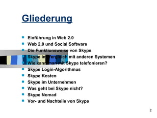 Das Dokument behandelt Web 2.0 sowie die Funktionsweise und Vorteile von Skype, einer Voice-over-IP-Software. Es beschreibt die Entwicklung von Web 2.0, seine Prinzipien, und setzt sich mit der Social Software auseinander, bevor es detaillierte Informationen über Skype, dessen Kostenstruktur und Anwendungsbereiche im Unternehmen liefert. Zudem werden die Vor- und Nachteile von Skype im Vergleich zu anderen Kommunikationssystemen analysiert.