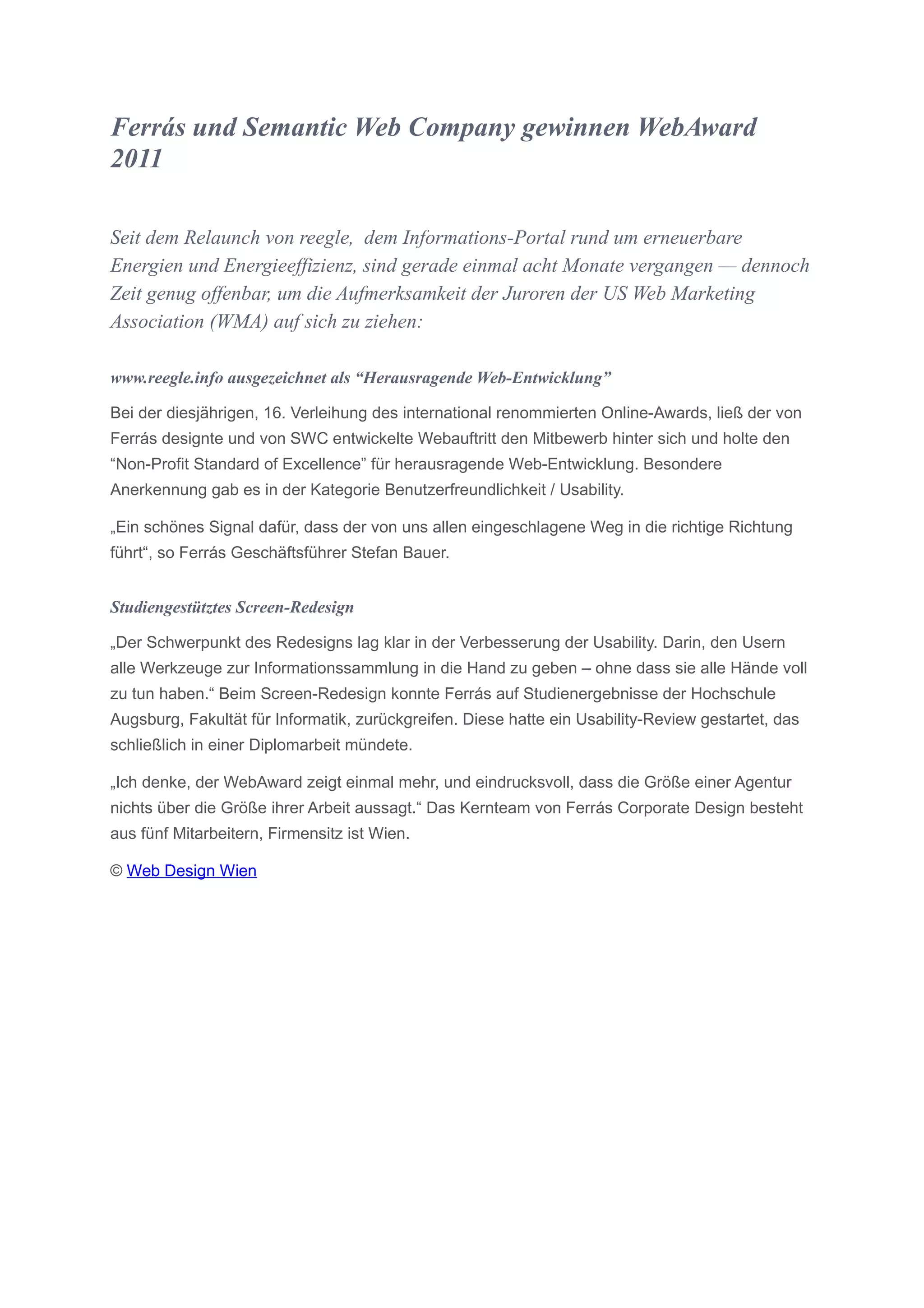 Ferrás und die Semantic Web Company wurden mit dem WebAward 2011 für den Relaunch des Informationsportals Reegle ausgezeichnet, das sich auf erneuerbare Energien und Energieeffizienz konzentriert. Der Award für herausragende Webentwicklung hebt die Benutzerfreundlichkeit des Portals hervor, das auf studiengestützten Redesigns basiert. Geschäftsführer Stefan Bauer betont, dass die Auszeichnung zeigt, dass die Qualität der Arbeit nicht von der Größe der Agentur abhängt.