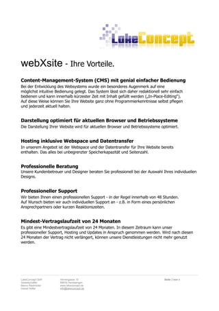 Webxsite ist eine professionelle und benutzerfreundliche Lösung zur Erstellung individueller Websites, einschließlich Hosting und Support. Die Plattform bietet ein einfaches Content-Management-System (CMS) für eine intuitive Inhaltspflege ohne Programmierkenntnisse sowie professionelle Beratung und Unterstützung. Die Mindestvertragslaufzeit beträgt 24 Monate und nach Vertragsende sind die Dienstleistungen nicht mehr verfügbar.