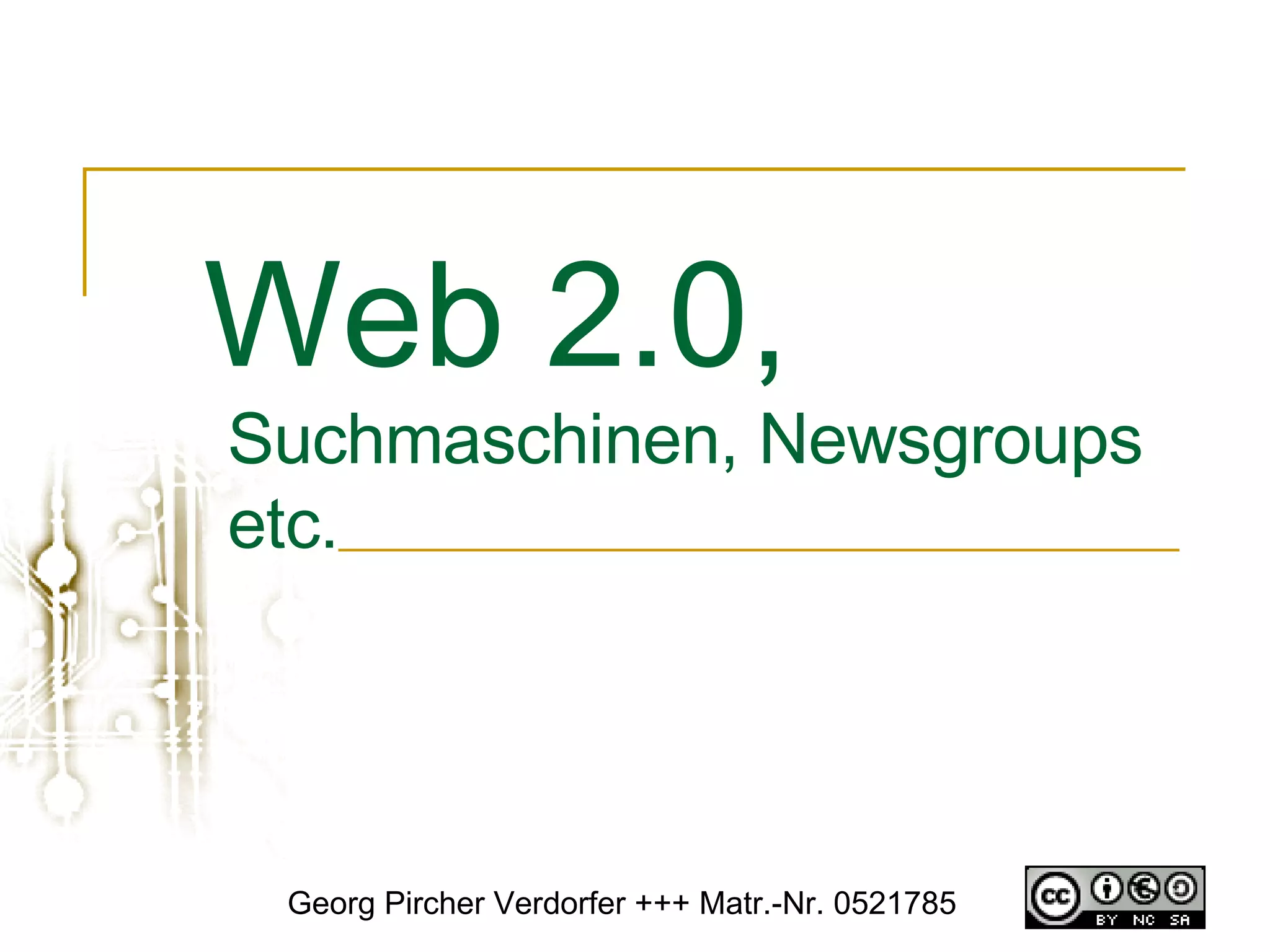 Der Dokument behandelt die Entwicklung des Web 2.0, beginnend mit seiner Vorgeschichte und den verschiedenen Phasen des Internets, darunter Web 0.5, 1.0 und 1.5. Es werden Haupteigenschaften und Technologien des Web 2.0, wie soziale Netzwerke, APIs, und kollaborative Intelligenz, erläutert, sowie die Rolle von Suchmaschinen wie Google und Newsgroups. Zudem wird die Bedeutung von Standards wie AJAX, CSS, und RSS hervorgehoben und der Unterschied zwischen Newsgroups und Webforen thematisiert.