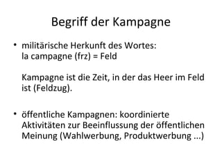 Das Dokument behandelt Praktiken und Techniken des Webcampaignings im Rahmen des Moduls "Engagement 2.0/K12". Es definiert den Begriff der Kampagne, mögliche Ziele, und erläutert wesentliche Praktiken wie Informieren, Einbeziehen, Verbinden und Mobilisieren. Zudem werden Techniken wie Linking, Coproduction und Convergence hervorgehoben, die entscheidend für den Erfolg von Webkampagnen sind.