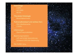 Das Dokument bietet ein umfassendes Update zu pneumologischen Erkrankungen und deren Behandlung, einschließlich COPD, Asthma und pneumonialen Infektionen. Es beschreibt therapeutische Ansätze, Risikobewertungen sowie die Bedeutung von Impfungen und physiotherapeutischen Maßnahmen. Zudem werden aktuelle medikamentöse Therapien wie die Anwendung von Inhalationskortikosteroiden und neue Medikamente für resistente Tuberkulose behandelt.