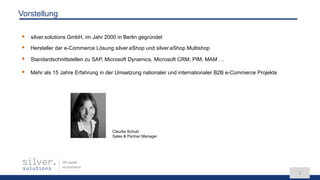 Das Dokument stellt die Vor- und Nachteile von E-Commerce-Marktplätzen im Vergleich zu eigenen Händlerplattformen vor, wobei die Silver.Solutions GmbH als Anbieter von E-Commerce-Lösungen hervorgehoben wird. Marktplätze bieten Händlern einen einfachen Eintritt ins Online-Geschäft, sind jedoch mit Herausforderungen wie starker Konkurrenz und hohen Kosten verbunden, während Händlerplattformen eine einheitliche Produktdarstellung und direkten Kundenkontakt ermöglichen, jedoch höhere Investitionen erfordern. Die Wahl zwischen diesen beiden Modellen hängt von den spezifischen Bedürfnissen und Ressourcen der Händler und Hersteller ab.