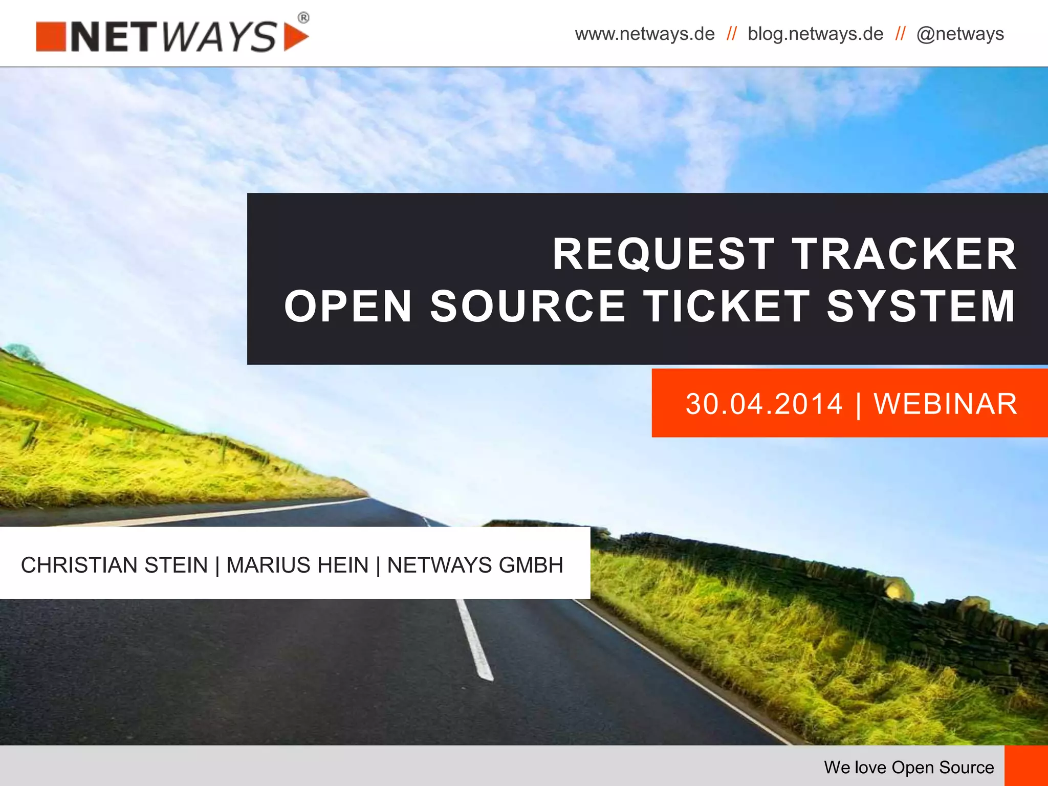 Das Dokument stellt die Netways GmbH vor, ein Unternehmen, das seit 1995 in den Bereichen Open Source Systems Management und Data Center tätig ist und derzeit 38 Mitarbeiter beschäftigt. Es behandelt den Request Tracker, eine Open Source Ticket-Lösung, die eine benutzerfreundliche und anpassbare Plattform für das Management von Tickets und die Kommunikation bietet. Darüber hinaus werden die Dienstleistungen, Schulungen und Produkte des Unternehmens sowie die bevorstehende Open Source Monitoring Conference im November 2014 erwähnt.